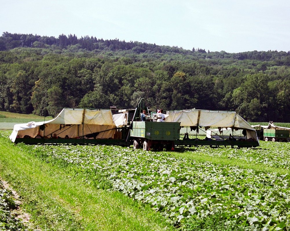© Sonja Hießberger/LK NÖ Eine Besonderheit der Erntevorgänge beim Fruchtgemüse stellen die Einlegegurken dar. Sie werden ab Juni bis September von Erntehelfern mittels sogenanntem Gurkerlflieger in Handarbeit geerntet. Dabei liegen die Erntehelfer auf dem Bauch und werden mit einer Maschine, welche einem Flieger gleicht, über das Feld gezogen. Die Einlegegurken werden nach dem Abpflücken in einem Anhänger deponiert und so rasch wie möglich in einen verarbeitenden Betrieb gebracht. Da die Einlegegurken schlecht zwischengelagert werden können, werden sie direkt nach der Ernte nach Größe sortiert und verarbeitet: Entweder geschnitten als Sandwichgurken oder wenn sie klein ausfallen als ganze Einlegegurken abgefüllt und im Gurkenglas aufbewahrt.