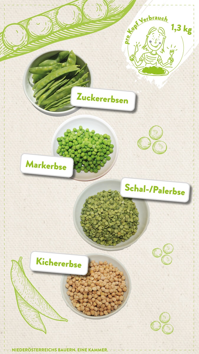 Weltweit gibt es an die 250 Sorten von Gemüse-Erbsen, von denen allerdings nur drei in Europa auch tatsächlich in größerem Stile für den menschlichen Verzehr angebaut werden, die Mark-, Schal- bzw. Pal- und Zuckererbse. Sie unterscheiden sich in Hülsenform, der Kornfarbe, der Reifezeit und Beschaffenheit der Samenkörner. Mit ihrer gelbgrünen Blütenfarbe kann man sie von der rosa-violett blühenden Futter- oder Ackererbse differenzieren. Die länglichen Hülsen sind ca. drei bis zehn Zentimeter lang und enthalten vier bis zehn Samen, welche man als Erbsen kennt. Das Samenkorn der Schal-, Pal-, Brockel- oder Körnererbse ist rund und glattschalig, die Samen sind sehr stärkehaltig und deshalb nicht so süß. Frisch essen kann man sie nur im jungen Stadium, ansonsten werden sie getrocknet. Die süßlich schmeckenden Körner der Mark- oder Runzelerbse sind trocken und meist runzelig. Junge Markerbsen sind aufgrund ihres Zuckergehalts süß und sehr zart, weshalb sie meist für Konserven oder Tiefkühlprodukte verwendet werden. Der Zuckererbsen fehlt die ungenießbare Pergamentschicht an der Innenseite der Hülse und so wird die Hülse mit den darin befindlich zarten Samen verzehrt. Ein hoher Zuckergehalt zeichnet sie aus.