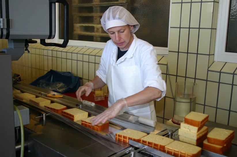 © LK OÖ Am Beginn der Schnittkäseherstellung steht die Zugabe von Lab in die rohe oder pasteurisierte Milch. Dadurch gerinnt die Milch und eine gallertartige Masse entsteht, welche nun mit der Käseharfe auf die Größe von Erbsen bis Haselnüsse geschnitten werden kann. Der weitere Ablauf ist ident mit der Hartkäseherstellung: Nach diesem Schritt trennt sich die Molke vom Käsebruch, dem festen Bestandteil, welcher nun anschließend in seine charakteristische Form gebracht wird. Dies geschieht, indem er in Formen und Tücher gefüllt und gepresst wird, wodurch die Molke entfernt wird und der Käsebruch sich verfestigen kann. Nun spricht man vom „grünen Käse“, welcher in Form gebracht in ein Salzbad gelegt wird, und anschließend für eine Dauer von vier bis zehn Wochen reift. Während dieser Zeit verdunstet das Wasser aus dem Käseteig, worauf seine feste Konsistenz und die Härte der Rinde beruhen.