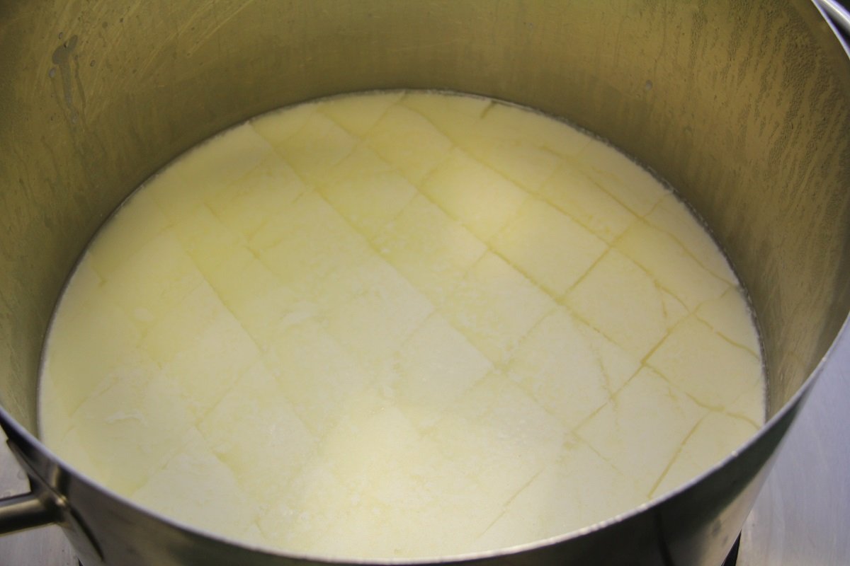 © Michael Wöckinger/LK OÖ Am Beginn der Herstellung von Hartkäse steht die Zugabe von Lab in die rohe oder pasteurisierte Milch. Dadurch gerinnt die Milch und eine gallertartige Masse entsteht, welche nun mit der Käseharfe auf die Größe von Weizenkörnern geschnitten werden kann. Es gilt, je kleiner die Käsekörner geschnitten werden, desto härter wird der Käse. Nach diesem Schritt trennt sich die Molke vom Käsebruch, dem festen Bestandteil, welcher nun anschließend in seine charakteristische Form gebracht wird. Dies geschieht, indem er in Formen und Tücher gefüllt und gepresst wird, wodurch die Molke entfernt wird und der Käsebruch sich verfestigen kann. Nun spricht man vom „grünen Käse“, welcher in Form gebracht in ein Salzbad gelegt wird und anschließend für eine Dauer von drei Monaten bis zwei Jahren reift. Während dieser Zeit verdunstet das Wasser aus dem Käseteig, worauf seine feste Konsistenz und die Härte der Rinde beruhen. Auch während dieser Reifezeit, deren Länge von der Sorte des Käses abhängt, muss dieser regelmäßig gepflegt werden. Für ein Kilogramm Hartkäse benötigt man ca. 13-15 Liter Milch.