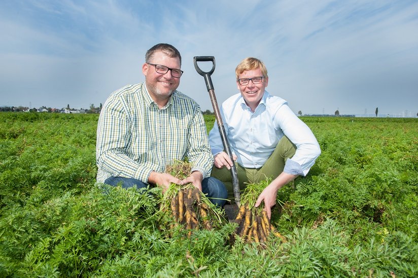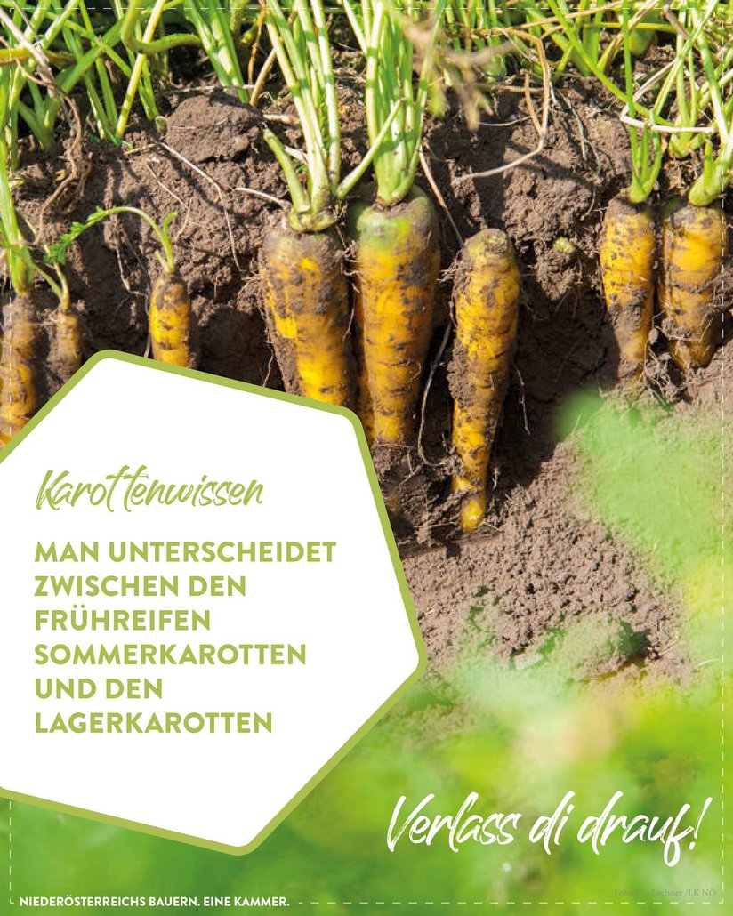 © Eva Lechner/LK NÖ Die Karottenernte reicht von Juni bis November und hängt davon ab, ob und wie sie weiterverarbeitet werden. Kommen sie direkt nach der Ernte auf den Markt, handelt es sich um Karotten, die bis Mitte Juli geerntet wurden. Ein späterer Erntezeitpunkt gilt für Lagerkarotten, die eingelagert und das ganze Jahr über angeboten werden. Je nachdem ob die Karotte für den Direktverzehr oder als Tiefkühlgemüse gedacht ist, werden unterschiedliche Erntemaschinen benötigt. Bei der Ernte als Frischgemüses werden die Karotten mithilfe einer Maschine an ihrem Kraut aus der Erde gezogen, dieses wird entfernt und die Karotten gelangen mittels Förderband in jene Kisten, in denen sie gelagert werden. Tiefkühlkarotten werden mitsamt dem Erddamm von der Maschine aufgenommen, die Karotten von der Erde getrennt und der grüne Ansatz samt Kraut entfernt.