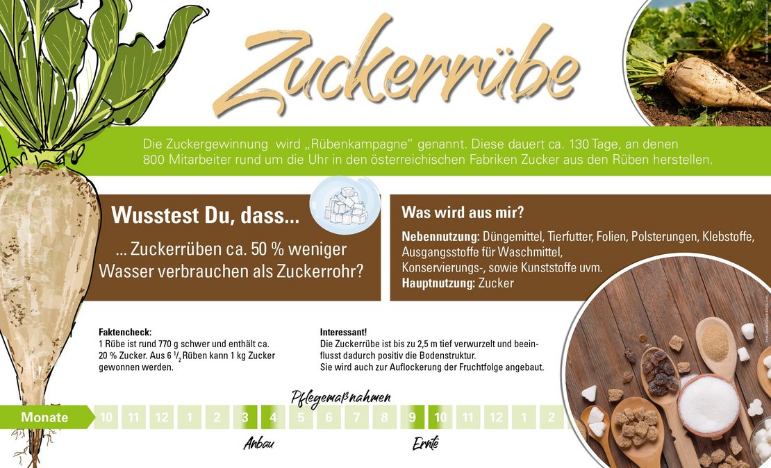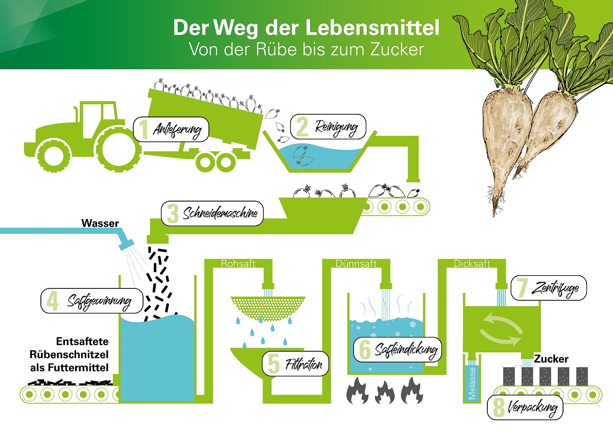 Die Zuckerrübe ist eine zweijährige Pflanze, wobei das zweite Vegetationsjahr nur für die Samengewinnung von Relevanz ist. Die Rübe setzt sich - vereinfacht dargestellt - aus den Rübenblättern, dem Rübenkopf (der die Basis der Blätter ist) und der Rübenwurzel bzw. -körper (aus dem der Zucker hergestellt wird), zusammen. Im Herbst erfolgt die Ernte, da zu diesem Zeitpunkt die Rüben am zuckerhältigsten sind. Die Verarbeitung hat rasch zu erfolgen, da durch die Lagerung der Zuckergehalt in den Rüben abnimmt.