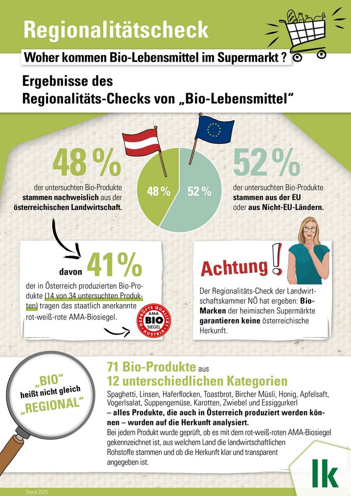 Untersuchungen zeigen, dass Konsument:innen beim Kauf von Bio-Lebensmitteln vermehrt bewusst österreichische Bioprodukte bevorzugen. Kann man aber immer schnell und einfach erkennen woher die Produkte stammen? Ein Regionalitäts-Check der Landwirtschaftskammer Niederösterreich verdeutlicht, dass viele Bio-Produkte in Supermärkten noch nicht aus heimischer Produktion kommen. Bei über der Hälfte der untersuchten Produkte sind die Rohstoffe nicht aus Österreich. Von den untersuchten Bio-Produkten aus nachweislich österreichischer Produktion sind 41 Prozent mit dem rot-weiß-roten AMA-Biosiegel, das als einziges staatlich anerkanntes Siegel heimische Herkunft bei Bio-Produkten garantiert, gekennzeichnet.