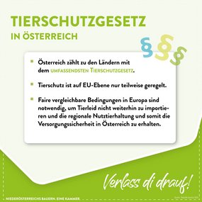 Österreichs Bäuerinnen und Bauern setzen hohe Standards im Bereich Tierwohl um, beispielsweise durch den Ausstieg aus Vollspaltenböden. Österreich ist eines der wenigen Länder im EU-Binnenmarkt, das den Ausstieg aus Vollspaltenböden eingeleitet hat. Diese Qualitätsstandards sollen weiter ausgebaut werden, allerdings benötigen die Betriebe praxistaugliche und langfristig gültige Regelungen. Derzeit ist die Nachfrage nach mehr Tierwohl – insbesondere im Schweinebereich – noch gering. Daher ist es wichtig, dass alle Akteure entlang der Wertschöpfungskette, einschließlich Konsument:innen, Gastronomie und öffentlicher Beschaffung, diesen Weg unterstützen. Die Landwirtschaftskammer Niederösterreich weist auf eine bereits negative Entwicklung bei der Pute hin und befürchtet Ähnliches beim Schwein.