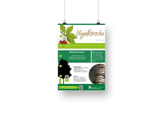 Bauminfotafeln am Waldrand bieten die Möglichkeit, Spaziergeher:innen über die Bäume entlang des Weges zu informieren. Was wächst hier und was wird daraus? Aufgelockert mit interessanten "Wusstest du, dass", bunten Grafiken, einem Hinweis zum Keltischen Baumhoroskop und natürlich einer anschaulichen Höhenangabe, wie groß der Baum vor einem wird, sind die Tafeln ein informativer Hingucker.