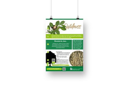 Bauminfotafeln am Waldrand bieten die Möglichkeit, Spaziergeher:innen über die Bäume entlang des Weges zu informieren. Was wächst hier und was wird daraus? Aufgelockert mit interessanten "Wusstest du, dass", bunten Grafiken, einem Hinweis zum Keltischen Baumhoroskop und natürlich einer anschaulichen Höhenangabe, wie groß der Baum vor einem wird, sind die Tafeln ein informativer Hingucker.